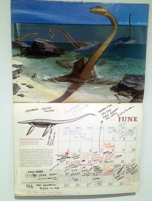 Another theme that Peter Schjeldahl dwells on in his review in this week’s New Yorker has to do with commemorating dead artists, both those who significantly influenced their peers and those who died in semi-obscurity, many though not all of them from the generation of artists lost to AIDS. Some of what’s displayed isn’t artwork as much as artifacts of interest, like this mysteriously poignant wall calendar that David Wojnarowicz used to record appointments: