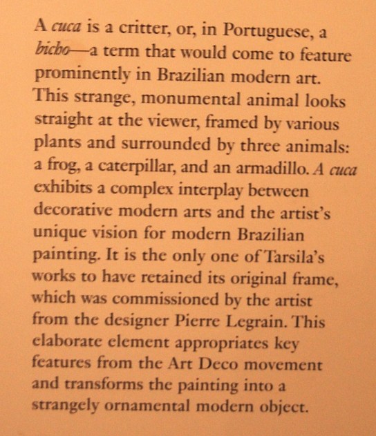 This delightful cartoony Kenny Scharf painting (“Escaped in Time, I’m Pleased,” above) prepared me for the colorful figuration all over the Tarsila do Amaral retrospective, with its inquisitive-looking critters and its theme of anthropophagy.