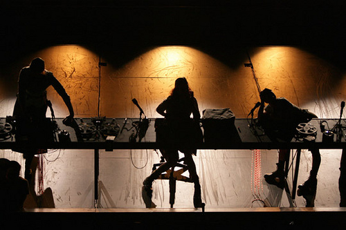 For this piece, the TV monitors played scenes from Marx Brothers movies and dance performances by Martha Graham and Merce Cunningham. Unbenownst to the audience, the performers interact with these video clips according to an elaborate, tricky set of rules devised during the development of the piece. The TV monitors present the actors with gestures, facial expressions, movements, or video effects to imitate with their bodies, sometimes tightly choreographed, sometimes left to improvisation. It sounds impossibly difficult to juggle these various tasks; it sounds a little monstrous, as if the director is manipulating the actors by remote control. But that’s what makes the Wooster Group so exceptional. They approach these complicated performance scores with the verve and skill of Olympic athletes while also looking like kids having fun playing.