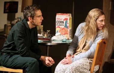 I say, in part: “The House of Blue Leaves is such a famous play—its premiere in 1971 gave Guare, one of our best playwrights, his first hit—and the 1986 Lincoln Center Theater revival is still so fresh in the memory that it’s easy to forget what a strange and unconventional play it is… The new Broadway revival looks fantastic on paper. The stars include Ben Stiller (above left) as Artie, Edie Falco (above right) as Bananas, and Jennifer Jason Leigh as Bunny (a role first played by Stiller’s mother, Anne Meara), and the director is David Cromer, who staged phenomenal productions in recent years of Thornton Wilder’s Our Town (which ran for two years Off Broadway) and the Broadway revival of Simon’s Brighton Beach Memoirs…. Sad to say, Cromer’s production gets it all wrong.”