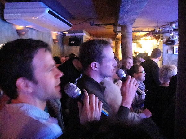 January 16 – The University Glee Club of New York hosted the Cornell Glee Club for a concert at Alice Tully Hall that Andy, a fervent Cornell alum, bought tickets for, so I went along, like a good boyfriend. It’s kind of wacky watching a stage full of 100 almost-all-white alter kockers crooning sea chanties and Negro spirituals. The Cornell undergrads were a little crisper and more interesting musically. Their a capella doo-wop subset, the Hangovers, did a lovely rendition of “Fire and Rain.” Both clubs did a couple of numbers together, and then the conductor invited all the Cornell Glee Club alums in the audience to join them onstage for the school cheer and alma mater. Andy, a former Hangover, ran up to the stage as if his pants were on fire. Very sweet, however dorky. There was a black-tie reception afterwards, so we even wore tuxedoes! But the reception looked pretty stodgy so we bailed fast and wound up at Bartini, where Andy’s swimming-team mates were celebrating Win’s birthday. Whew! Talk about packt like a tin of sardines! And when the DJ sprayed the crowd with Lady Gaga’s “Bad Romance,” the three queens next to me went apeshit, practically tossing the furniture in the air with drunken glee. As they left, one of them said to me, “I’m so sorry you had to see that. We don’t get out much….”