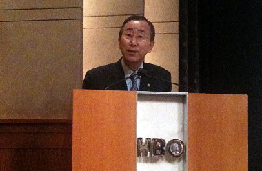Andy’s job at the United Nations these days required him to compose talking points for UN Secretary General Ban Ki-Moon (above) to deliver at a screening of Jennifer Arnold’s documentary A Small Act, so he got invited to the screening at HBO and I tagged along as his plus-one. The film tells one of those classic inspiring stories. Decades ago, a Swedish schoolteacher named Hilde Back, who’d fled Nazi Germany as a child (her parents did not survive), signed up for one of those programs where a small monthly donation subsidizes the education of a specific child in Africa – in this case, Chris Mburu from a small village in Kenya. Mburu went on to the University of Nairobi and Harvard Law School and has worked as a human rights activist ever since. The film tracks his efforts to create a scholarship fund in Hilde Back’s name and the competition among village schoolchildren for the three available slots in a given year. As the title suggests, the essence of the film is to demonstrate how one small commitment has unforeseen resonance in the world. Arnold’s documentary tells that story modestly, with a minimum of generic sentimentality and an honest attention to the ambiguities and contradictions of cross-cultural philanthropy and the challenges of education in developing countries. Arnold, Mburu, camerawoman Jennifer Lee, and producer Jeffrey Soros were on-hand for a Q&A afterwards. And in lieu of goodie bags, HBO distributed $10 Good Cards, which allow you to donate money to your favorite charity via the website Network for Good (which they astutely market with the headline “When the people in your life don’t need more STUFF as a gift….”).