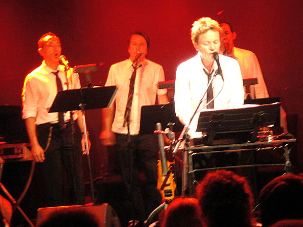When I heard that Laurie Anderson would be playing at Le Poisson Rouge, I thought it might be really great to see her in such an intimate club setting. But I forgot how much I hate concerts where you have to stand the whole time (after standing in line for 45 minutes waiting to get in). And the gig stood as a promo party for her new Nonesuch CD Homeland, which is not one of her most compelling outings. The songs are minor, meandering, not especially melodic. And the club environment didn’t seem to open up any new possibilities. In fact, weirdly, Laurie seemed to retreat, barely making eye contact with the audience, reading from the script on her music stand. Perhaps she needs the distance of a stage to connect, or seem to connect. Plus, these days she performs without visuals, and I realize only in retrospect that the visuals always added a poetic element that made her songs so much more than the sum of the words and the music. So it was a somewhat disappointing evening. But I suppose it’s the disappointment of a longtime fan whose mind has been blown many times by her wit and invention – how many artists can keep that up for three decades? She had a fascinating band that consisted of a keyboardist, a handsome sax player, three nerdy-boy backup singers (all dressed like Laurie in white shirts and skinny black ties), and one of my culture heroes, the legendary producer Bill Laswell, on bass (a sweaty night in Manhattan, and this stocky hipster was wearing a suit jacket and wool cap – whew). There were a few appearances of Fenway Bergamot, the name Laurie has given to the male character she creates by running her voice through a filter that drops the pitch an octave. And her encores were fascinating, weird, beautiful bursts of solo violin improve. The best songs in concert, as on the new album, were the up-tempo “Only an Expert” (see Laurie’s website for the results of a competition for best remix) and the mournful “Dark Time in the Revolution.” The latter, with its refrain of “they keep calling ’em, calling ‘em up,” seems to belabor the obvious point that wars are fought by kids – but it’s hard to argue with the truth of it, and the refrain gets more emotionally affecting as it goes along, and as the wars drag on.
