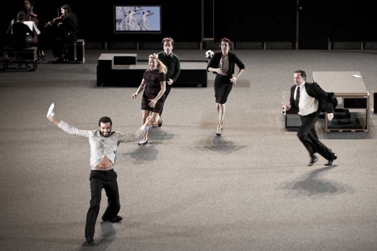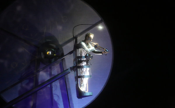 That evening, Adam and Andy and I had the pleasure of encountering another artist with a highly individualized vision cultivated over the course of several decades. When Karlheinz Stockhausen died in 2007, he had completed a magnum opus called Licht, a cycle in seven parts that takes 29 hours to perform in full. It is an elaborate, quirky mythopoeic “opera” with no singers in which each day of the week has its own color – just to mention a few of its eccentricities. The Lincoln Center Festival wisely bit off just a chunk of this giant work, a one-hour selection from Act II of Donnerstag aus Licht (“Thursday”) called Michaels Reise um die Erde (Michael’s Journey Around the Earth). It was originally staged at Vienna’s Taschenoper by Carlus Padrissa, a member of the wildly adventurous Catalonian performance company La Fura dels Baus, featuring the Cologne-based Ensemble musikFabrik. Stockhausen’s score is characteristically modern, which is to say not especially melodic. Heavy on horns, it reminded me at times of some of Frank Zappa’s whimsical/lyrical classic compositions, and it was exquisitely played by the ensemble.