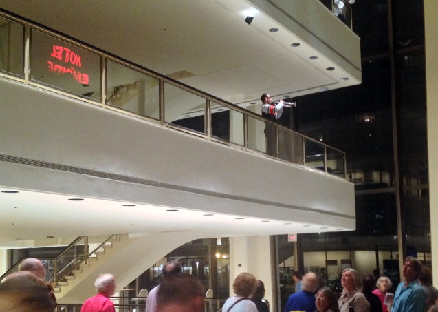 Just by itself, it might have been a little dry to sit through, but Padrissa came up with an elaborate visual production with striking and witty projections, colorful costumes, and an amazing contraption for the trumpeter who plays the Archangel Michael – a kind of cage he’s strapped into that revolves him through space so at times he’s playing upside down. In the piece, Michael flies around the world making stops in Cologne, New York, Japan, Bali, India, Central Africa, and Jerusalem. The program notes mention the musical motifs that Stockhausen used to refer to these locations but they’re laughably glancing. There’s a lot to make fun of about Stockhausen – in his vision, Thursday is associated with the color blue, so the audience at Avery Fisher Hall was encouraged to wear bright blue clothing (they stopped short of issuing uniform smocks the way Park Avenue Armory did for the staging of Oktaphonie earlier this year) – but I admire his mind and his effort. Adam and I enjoyed the concert more than Andy, who chafed at the lack of melody to follow. Departing the theater the audience was serenaded by five musicians playing a farewell piece from the balconies of Avery Fisher Hall (below) – a final lovely, quirky treat. The program notes, generous and informative, can be read online here.