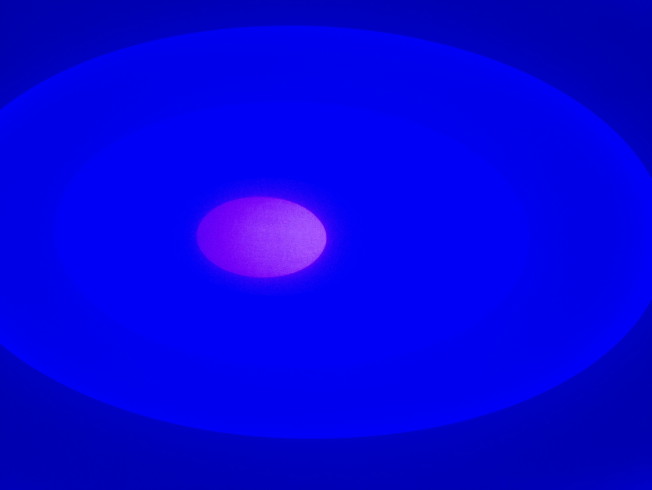 It’s savvy marketing for the Guggenheim to encourage picture-taking AND it’s a cosmic joke for several reasons. Turrell’s beautifully chosen lighting discombobulates your camera’s color-recognition capabilities. What you’re seeing never matches what your camera can capture. And even though you can get some gorgeous photos this way (check out my photodiary shots), it’s almost impossible to tell what you’re looking at because Turrell’s work toys so masterfully with dimension and flatness. It is, in a certain way, his one trick – making light simply projected onto flat surfaces look three-dimensional, or lighting depths in such a way as to make them look flat. (Is that two tricks or one?) The single example of the latter phenomenon on view at the Guggenheim, a piece called “Illtar,” is very very subtle and takes time to really perceive – and unfortunately it’s installed in a less than optimal manner. Although the room is small and the number of viewers limited, I could never get a purchase on it (after waiting on yet another line for half an hour to see it). Nevertheless, the Guggenheim show is a great opportunity to tap into an artist who’s sustained a deep original vision for a very long time. For a good overview, check out the New York Times Magazine’s recent profile of him.