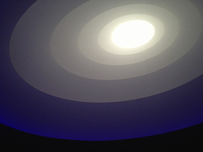 Last Friday morning Andy and I and Keith Hennessy’s boyfriend Adam Kuby (visiting from Portland for the day) made a pilgrimage to one of the blockbuster art shows of the moment, the James Turrell exhibit at the Guggenheim Museum. There was a long line to get in but it moved pretty quickly – we were in the door within 20 minutes, and shortly after that we were lying on our backs on the floor of the rotunda witnessing the main event of the show, a piece called Aten Reign. Turrell, a conceptual artist whose chief medium is light, has converted the Guggy’s famous spiral into a multi-tiered cone emanating concentric circles of gorgeous light continuously shifting color and intensity. Like everyone else, we had our smartphones out immediately to take pictures.