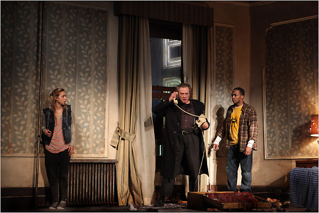 October 29 — Thomas Ostermaier’s bizarre and slapstick-y production of Hamlet started out at the Schaubuhne in Berlin in 2008 and completed its round of touring at Brooklyn Academy of Music. This stripped-down version employs six actors playing all the roles on a stage filled with dirt. The show starts with something that’s not in the play, the burial of Hamlet’s father, so that the wedding banquet literally takes place astride the grave. Many familiar, seemingly crucial scenes and lines were cut. “To be or not to be” occurred several times. And maybe because we were reading the subtitles while the actors spoke German, I encountered lines I swear I’ve never heard before in the umpteen productions of Hamlet I’ve seen in 50 years of theatergoing, such as “Eat a crocodile.” Surely Shakespeare didn’t write that? Guess again.