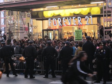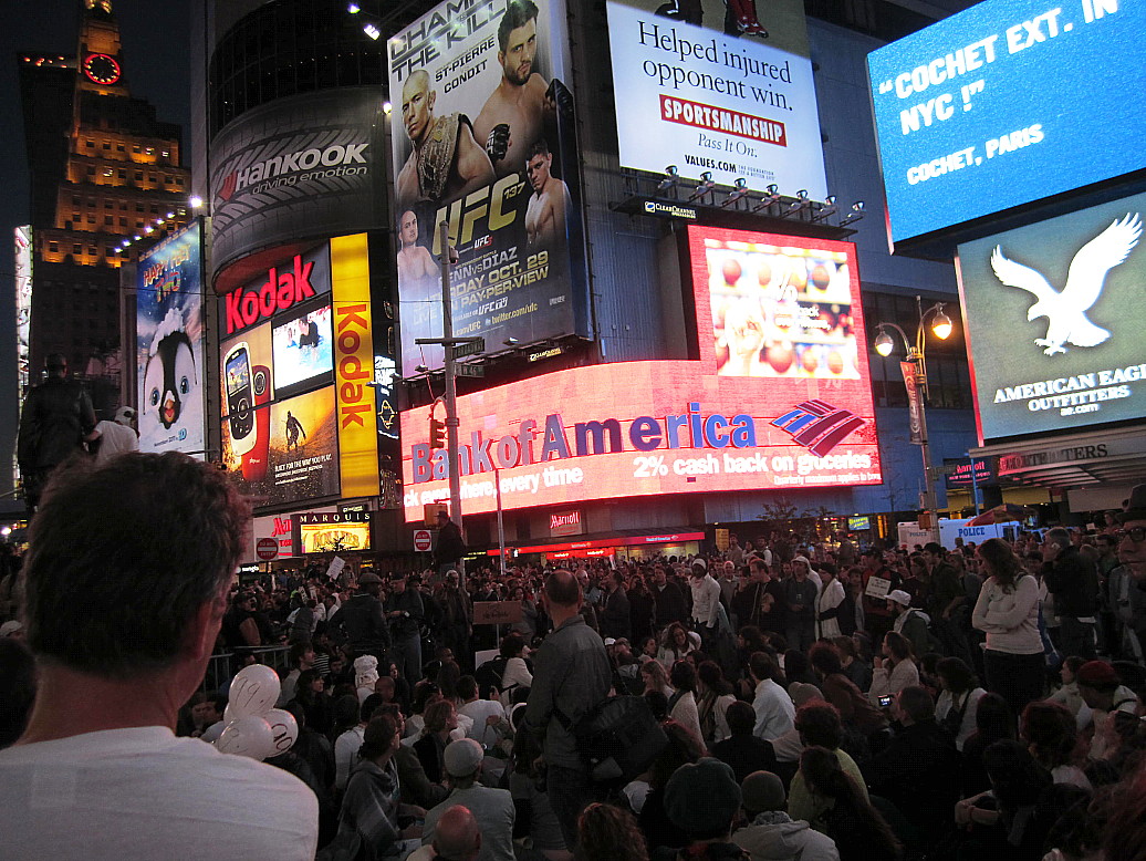 It started to look like one of those ugly us vs. them confrontations with the police. Cameras everywhere. Huge amount of testosterone and action-movie swagger on display. I saw one cop who looked exactly like a mad dog straining at his leash, looking for a fight. And there are always a few people in the crowd who unwisely stir things up — I watched a woman pointing a flag on a short sharp stick at the Mad Dog Cop from inches away. Taunting a frightened animal is a good way to get bit. The collective chant rang out across the intersection: “Who are you protecting? Who are you protecting? Who are you protecting?” That thought actually seemed to have a sobering impact on the police, and things settled down a bit. What were they protecting? I’d been standing on the west side of Times Square looking east, and when I turned around I suddenly understood what they were protecting.