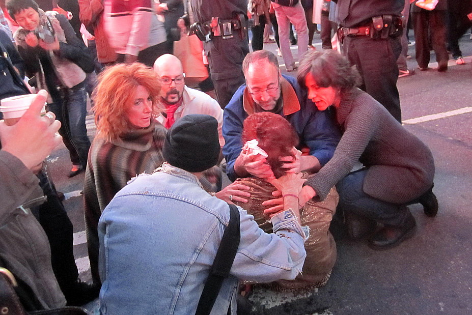 Tension zoomed high, with the police using metal barriers to try to contain the crowd. I heard a cop on his cel phone saying, “They want to take over the street and block traffic. We can’t have that.” Right, the people are exercising their first amendment rights to assemble peacefully and to express outrage at economic injustice, and you’re concerned about smooth flow of traffic. The skittish horses made everyone very nervous — those things are dangerous weapons. Suddenly, there was a flare-up, pushing and shoving at the barriers on 46th Street and the cops fanned out in all directions pushing people with the metal barriers. Apparently, there were some arrests. A middle-aged woman near me got knocked down and hit her head on the pavement badly.