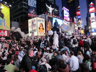 I showed up a little after 5:00, and for the first hour or so, the mood was low-key, sort of like a big party, everybody looking around expectantly, wondering what happens next. The main action going on was people holding up signs so that other people could take pictures and post them online. There was no central focal point, but Duffy Square was the nucleus. The police had blocked off the bleachers with barricades. A ragtag marching band pumped out tunes. Street performers on stilts entertained. I ran into David Denby, an old colleague from Boston newspaper days, and we noted the diversity of the gathering — largely but not completely white, youngsters but also oldsters (like us). And of course mixed in with the tourists and everyday Times Square inhabitants buying theater tickets at TKTS were the usual array of nutjobs happy to have a larger-than-usual audience, like the guy with the enormous crucifix bellowing “Come to Jesus!” steps away from the Naked Cowboy posing for smirky photos with pretty girls.
