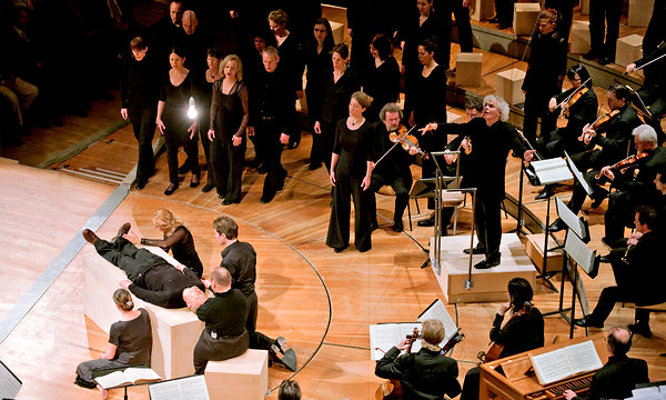 This piece is almost always performed as an oratorio, but Sellars staged it as a ritual and had not only the featured singers moving around the stage reenacting the trial, crucifixion, and death of Jesus Christ but also brought musicians with key solos forward. So at times John the Baptist (here called Evangelist and sung by Mark Padmore with what one review aptly called “heartbreaking eloquence”) would be addressing the cellist, or the mezzo-soprano Magdalena Kozena (playing Mary Magdalene) would be standing in a circle with two violinists. Asking chorus members to emote in unison could sometimes verge on corny but mostly Sellars’ staging had the intended effect of making an already sublime piece of music extra-dynamic. When it was over there was a silent pause of deep satisfaction for at least a minute before the applause began, morphing into a (justified, for once) standing ovation.