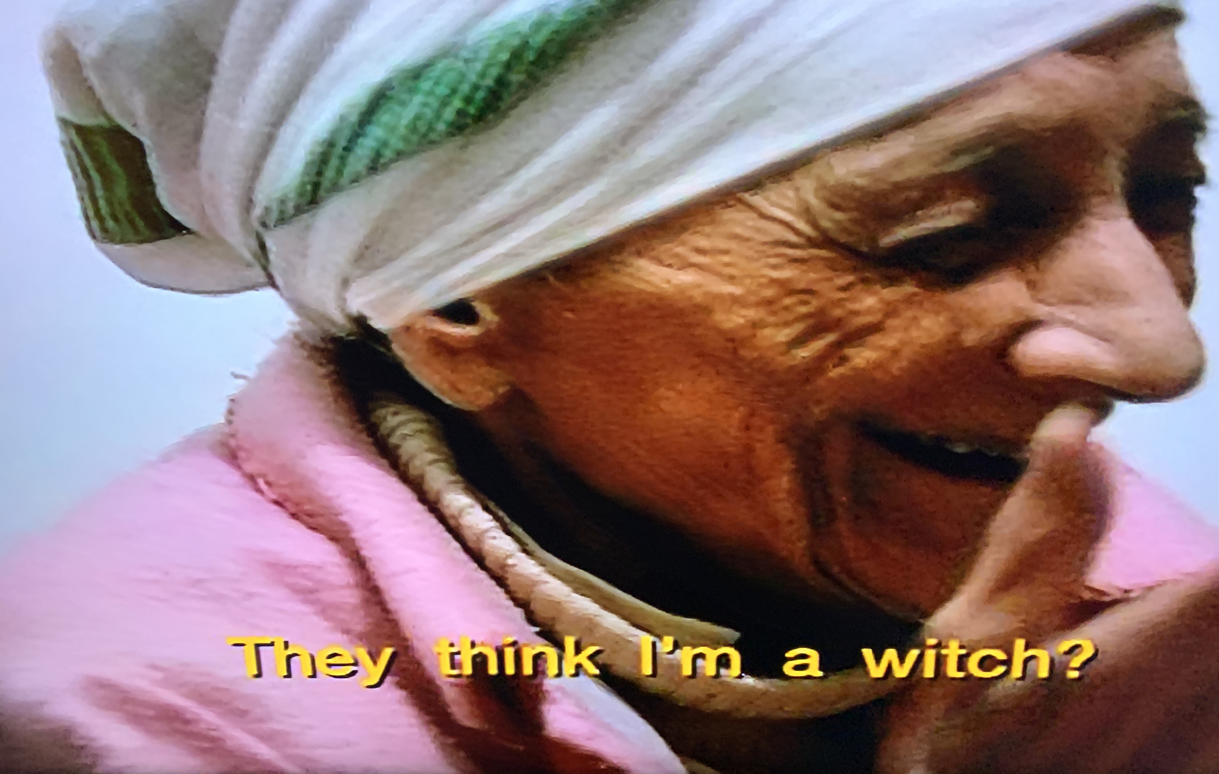 Jennifer Baichwal’s documentary Let It Come Down (available on DVD from Netflix) fed me plenty of tidbits. The filmmaker managed to get footage of a NYC hotel room meeting between Bowles (above), William S. Burroughs, and Allen Ginsberg, the last time those literary lions all met. Burroughs pronounces The Sheltering Sky “an almost perfect novel” (I agree) while also referring to Without Stopping, Bowles’ memoir, as Without Telling, because he’s so maddeningly discreet about anything having to do with sex, romance, or actual people (in contrast to Gore Vidal’s memoirs, which Burroughs appreciates for dishy gossip on every page). Bowles has nothing good to say about Bertolucci’s film version of The Sheltering Sky. I was also intrigued to see footage of Cherifa, Jane Bowles’s mysterious partner, as an old woman (below) repeating without denying rumors that she was a witch who exerted strange powers over JB.