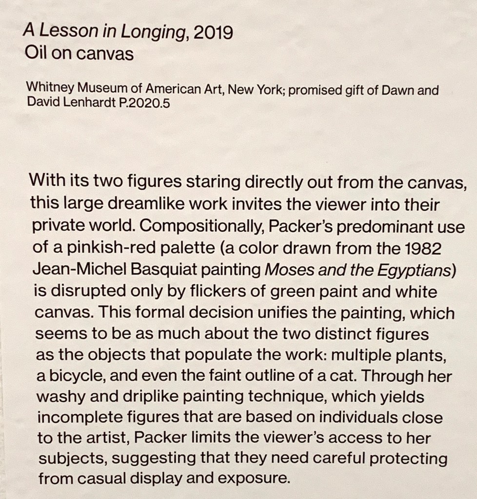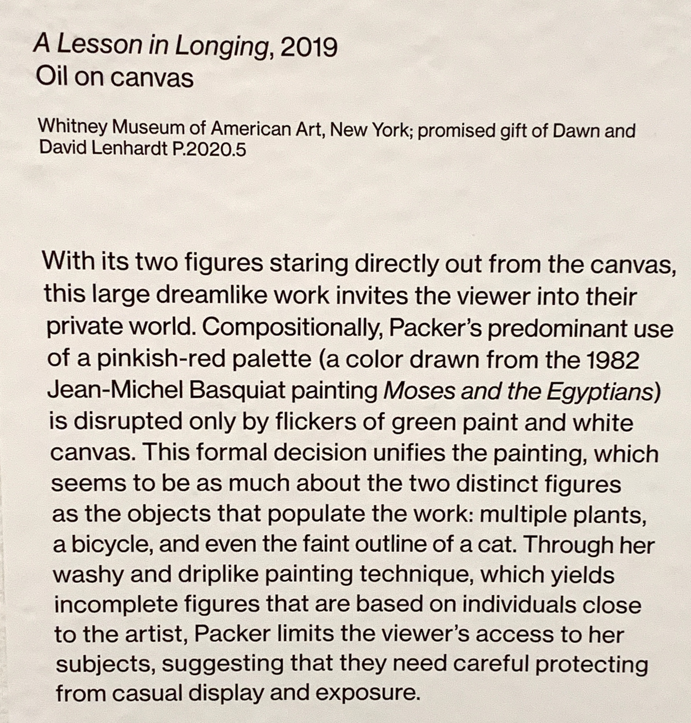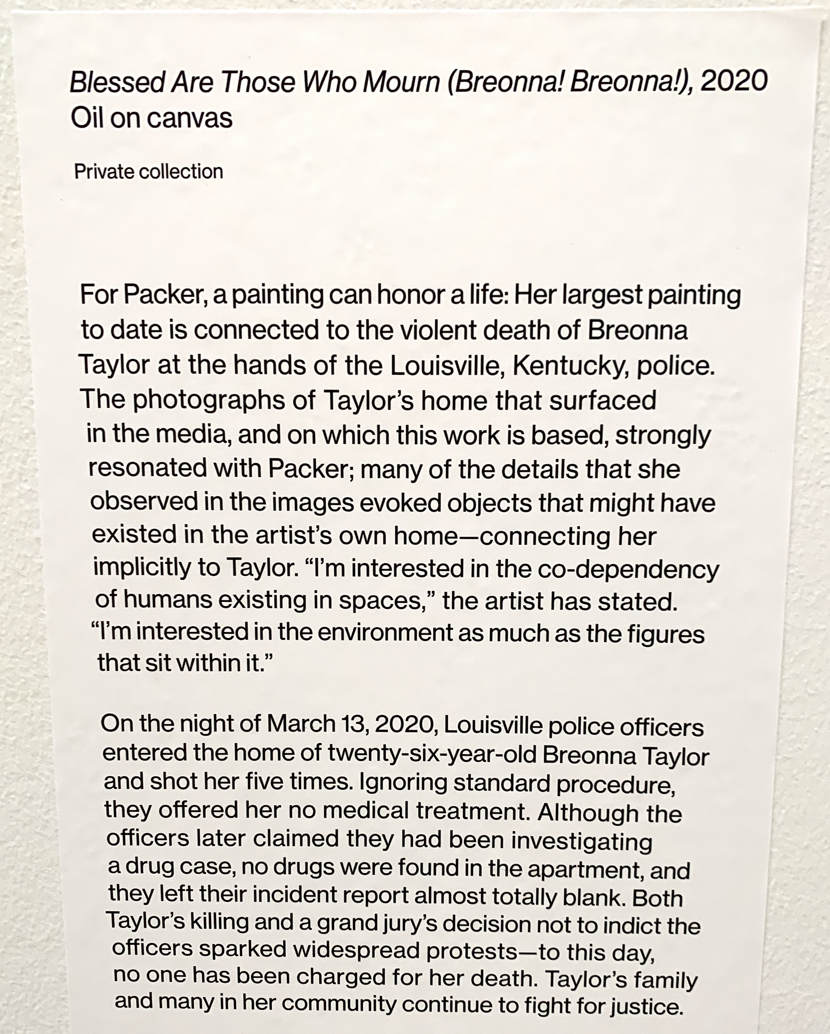 The real reward of this expedition was encountering the splashy exhibition by a painter new to me: Jennifer Packer: The Eye Is Not Satisfied With Seeing. Her large multilayered canvases merge representation and abstraction in unusual and beautiful ways.