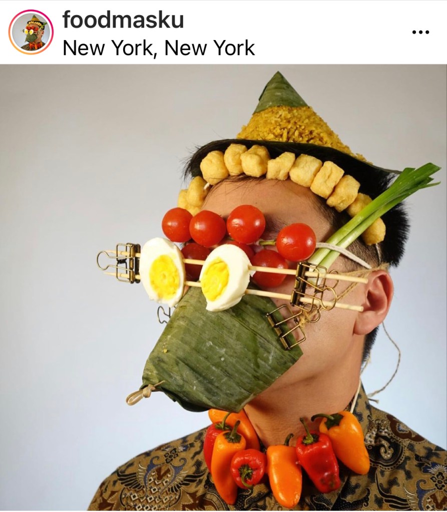 Among the other Human Beings were two artist friends who’d never met. I got to introduce Paul Wirhun (aka Rosie Delicious aka Egmananda), a radical faerie artist who specializes in psanky (eggshell painting), to Antonius Wiriadjaja (aka Oki), whose Instagram #foodmasku (“I make my meals into masks and then I eat them”) went from pandemic pastime to online sensation. Oki, whom I met playing with Gamelan Kusuma Laras, is also a victim of gun violence (innocent bystander to a drive-by shooting in Brooklyn) and tireless advocate for better gun control laws.