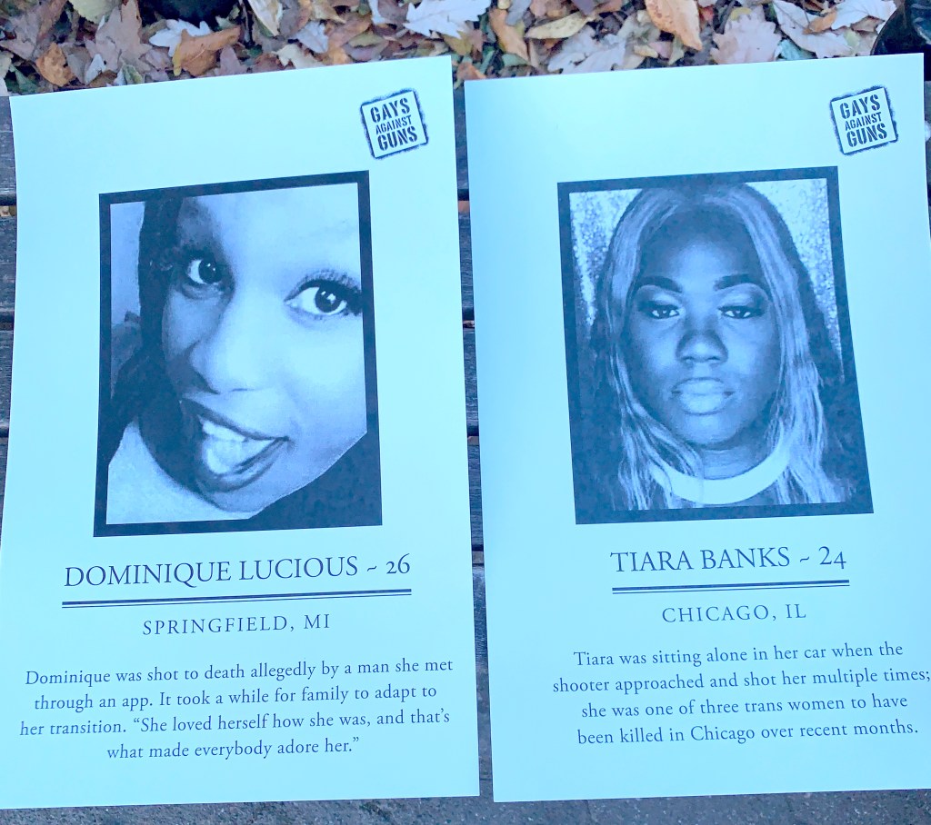 November 20 – Today was National Trans Day of Remembrance. As I’ve done numerous times in the past, I gathered with Gays Against Guns – the activist organization formed after the Pulse massacre in Orland in 2016 – and manifested as one of the Human Beings, silent veiled figures dressed in white representing victims of gun violence. I held placards commemorating Tiara Banks and Dominique Lucious, two of the 34 trans Americans killed by guns this year alone (more have been murdered through other means).